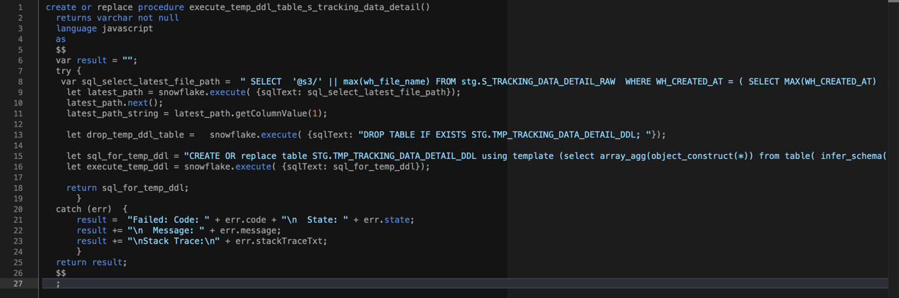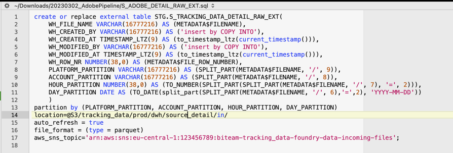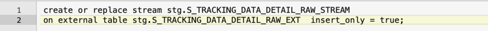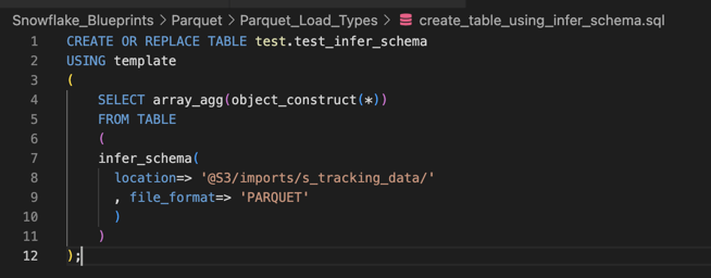 CREATE OR replace table STG.TMP_TRACKING_DATA_DETAIL_DDL using template (select array_agg(object_construct(*)) from table( infer_schema( location=>'" + latest_path_string + " ', file_format => 'ADOBE_PARQUET' ) ) );"