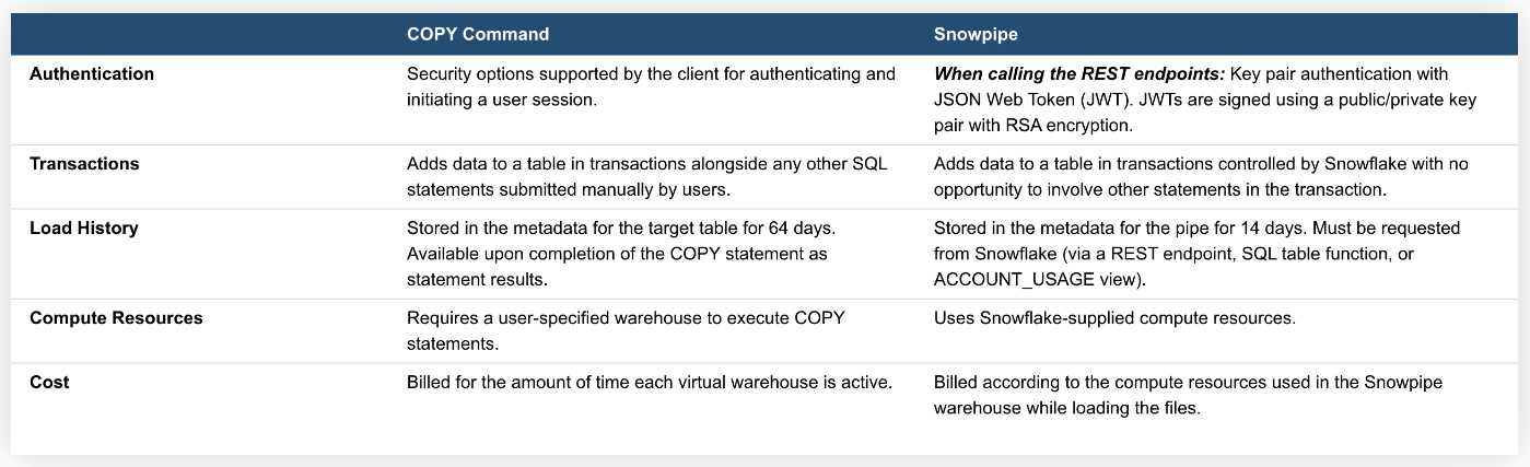 Hier eine kurze Übersicht über die Varianten COPY Command und Snowpipe.