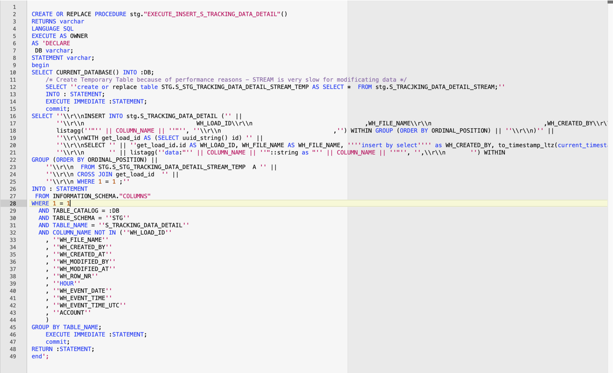 Schritt 4: Eine weitere Prozedur liest nun aus dem INFORMATION_SCHEMA alle Attribute aus, die in der Zieltabelle existieren und baut nun ein passendes SQL Statement, welches von der RAW - Tabelle den VARIANT Datentyp ausliest und die Inhalte auf die hunderte Ziel-Attribute verteilt.